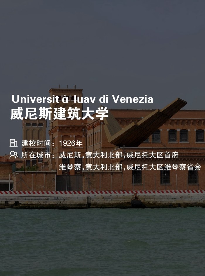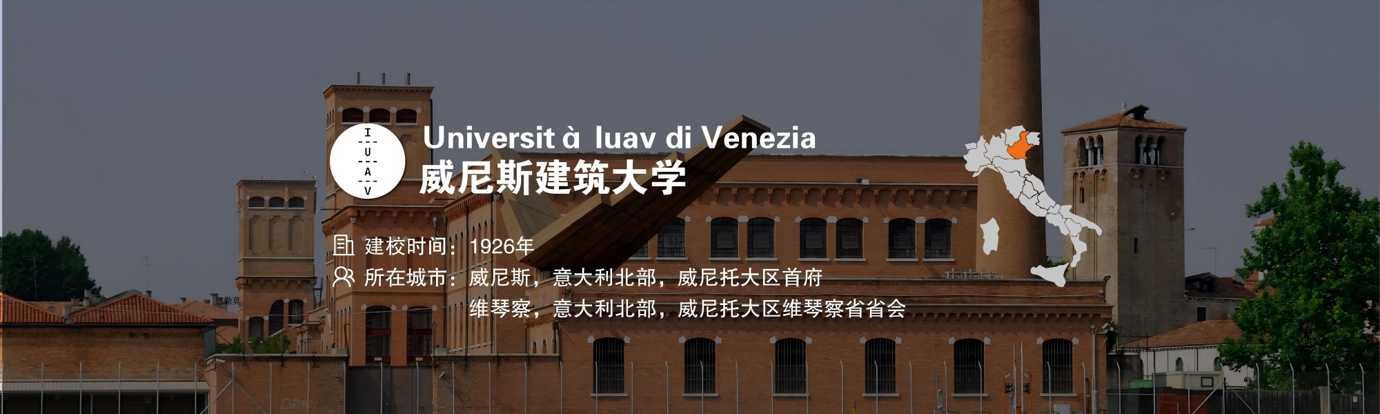 威尼斯建筑大学(Università Iuav di Venezia,简称 IUAV)于 1926 年在意大利水上历史名城威尼斯创立。目前,威尼斯建筑大学拥有两大校区及多个教学研究中心和实验室。Tolentini 主校区位于威尼斯主岛托伦蒂尼区的圣十字街,毗邻圣尼古拉教堂。Vicenza 校区则位于维琴察市的圣比亚焦广场,是设计学本科课程的教学基地。在 2025 年 QS 世界大学学科排行榜中,威尼斯建筑大学表现卓越,「艺术史」学科位列全球第 9 名、「建筑与建成环境」全球前 100 名,「艺术与设计」全球前 150 名,是在建筑与设计领域极具声望和影响力的意大利高等学府。